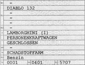 Übrigens habe ich gerade nachgesehen: Gemäss Fahrzeugausweis hört mein Diablo offiziell auf den Namen: LAMBORGHINI 132 Diablo VT