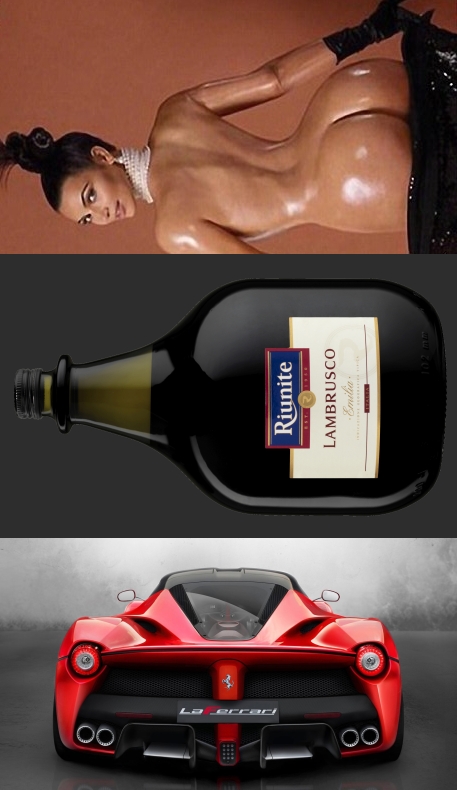 Auf dem Hintergrund waren untereinander, quer die Silhouette von einer nackten Frau, einer Flasche Rotwein und einem 308GTB.