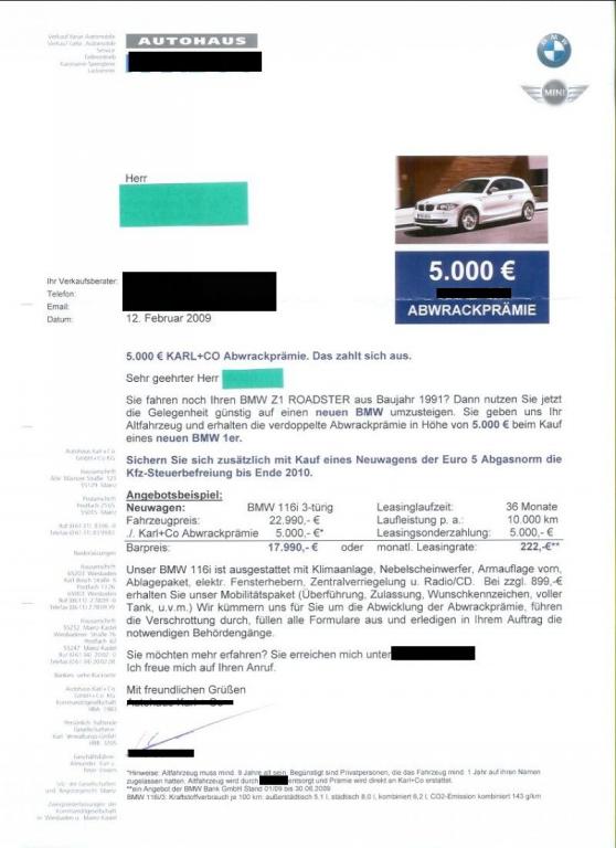 Ich könnte mir auch gut vorstellen, dass es einfach eine nette Idee ist um Aufmerksamkeit zu generieren. Ich denke der Händler weiß sehr wohl, dass die wenigsten Kunden einen Z1 gegen einen 116i eintauschen werden, aber evtl. macht man so seine Kunden ja auf den Preis für den 116i aufmerksam und dass die Abwrackprämie ja evtl. auch für den 10 Jahre alten Corsa gilt.