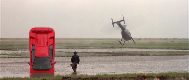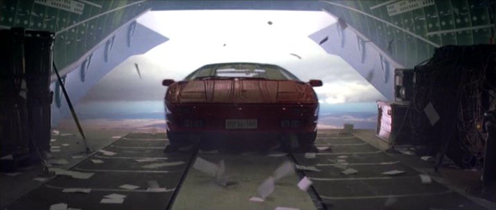 "Stirb an einem anderen Tag", in einer Szene wirft Bond verschiedene Fahrzeuge aus dem Flugzeug des Schurken und wenn ich mich recht erinnere steckt dann ein roter Diablo am Schluss mit der Front im Schlamm.