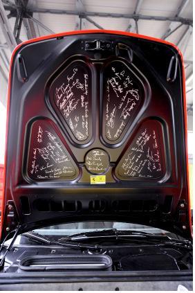 Und der besagte rote Scuderia, angeblich der allerletzte F430 weltweit. Unter der Haube haben alle Ferrari-Mechaniker aus dem Werk unterschrieben, wie im übrigen auch bei beiden gelben Fahrzeugen.