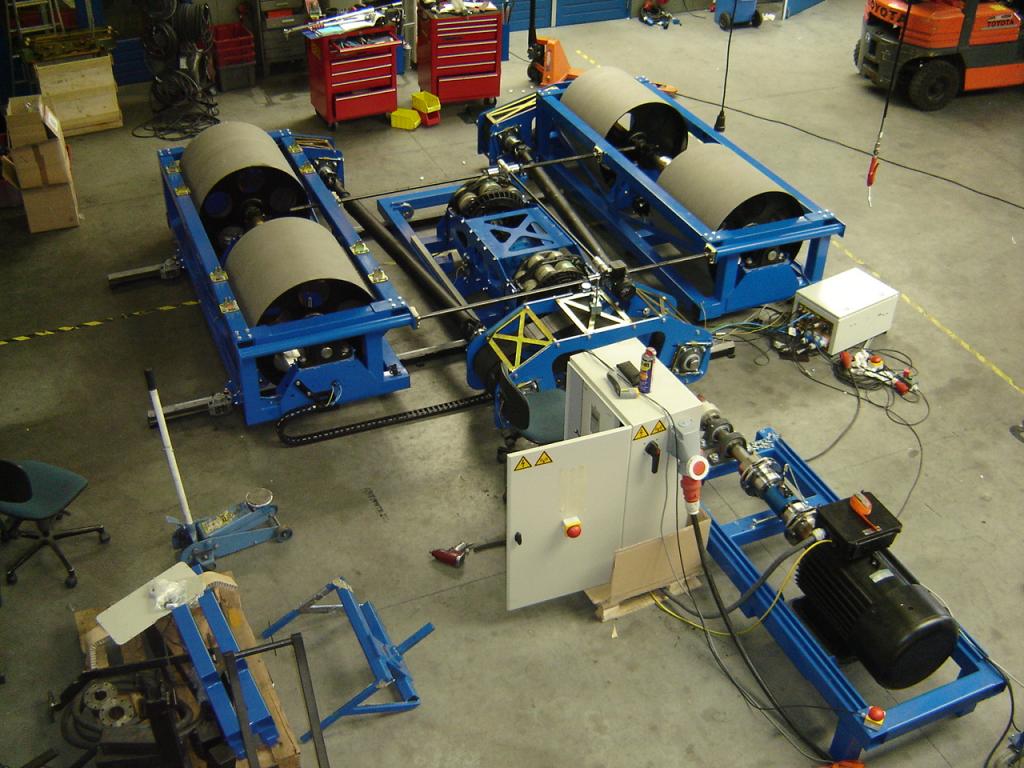 die vordere Achse und die hintere Achse sind mechanisch und durch Riemen miteinander verbunden, so kriegt die Elektronik des Fahrzeug nichts mit dass der Wagen auf dem Prüfstand ist. die vordere und hintere Räder machen die gleiche Drehzahlen wie auf der Strasse. gerade bei neuere Allrad Fahrzeuge ist es ein wichtiger Punkt da auch die Differentialen kaputt gehen können. und durch den Grossen Rollen hat der Prüfstand eine Höchstgeschwindigkeit von 350Km/h