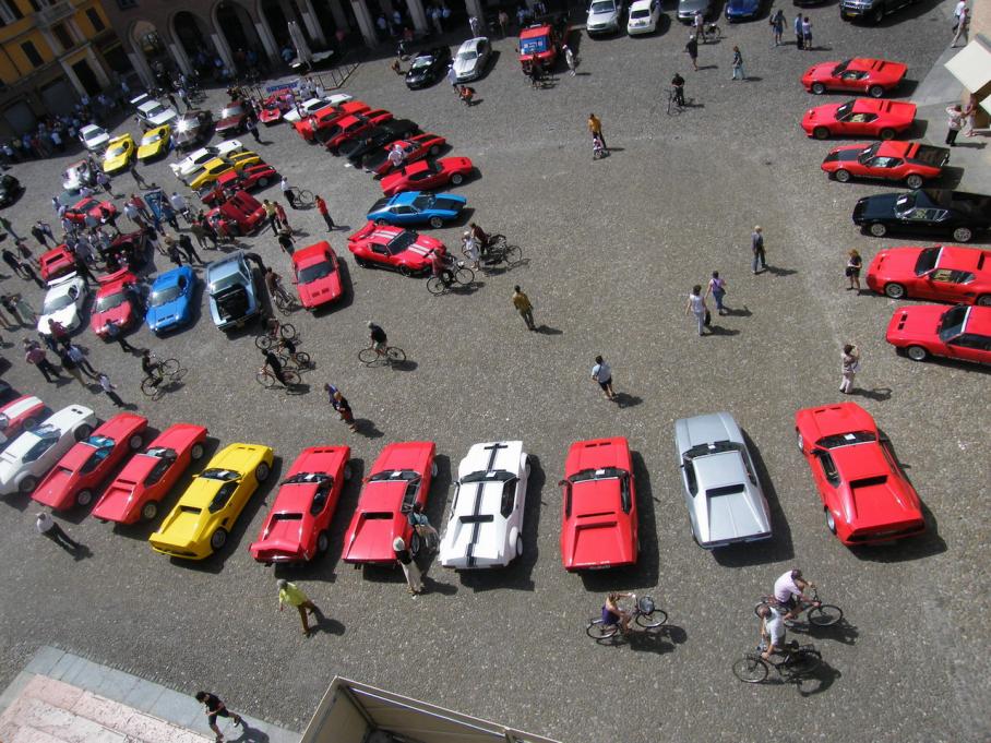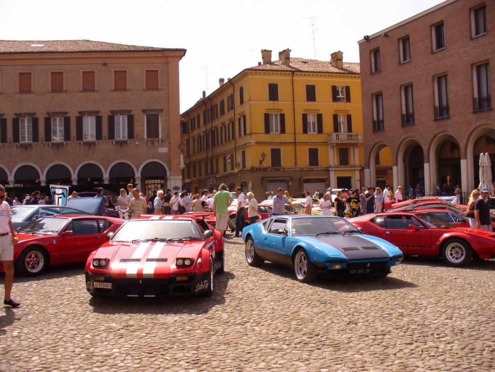 Genau 60 De Tomaso's auf der Piazza Grande in Modena am Sonntag vormittag.