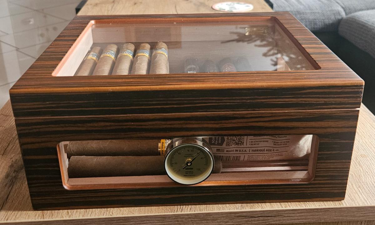 Anbei mein Humidor…und bevor einer was sagt, hatte den gerade offen deshalb stimmt der Wert der Luftfeuchtigkeit nicht 😜