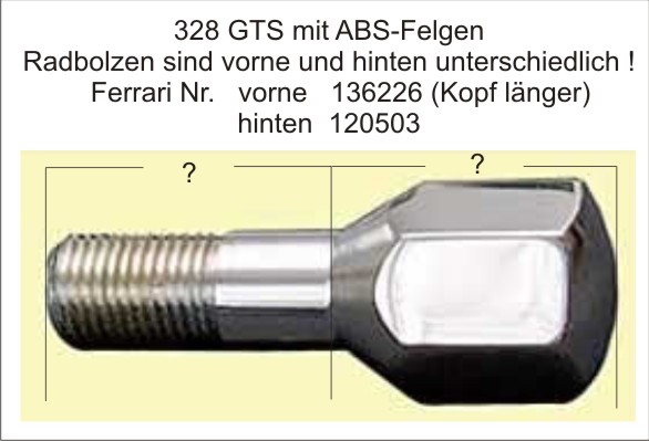 ich bin auf der Suche nach dem Maßen der Original-Radbolzen für 328 GTS mit nach außen gewölbten Felgen.