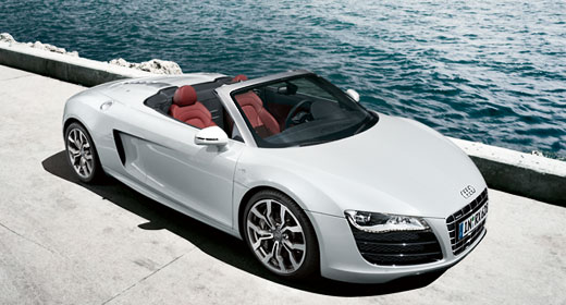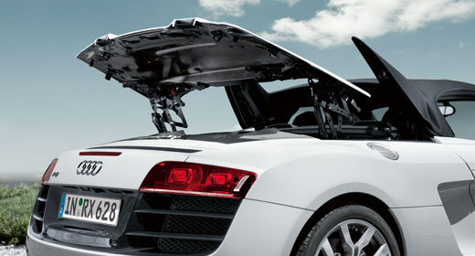 R8 Spyder 5.2 FSI quattro. Sein leichtes Stoffverdeck hat einen vollautomatischen Antrieb, einige Bereiche der Karosserie bestehen aus Kohlefaser-Verbundmaterial.