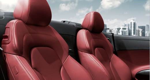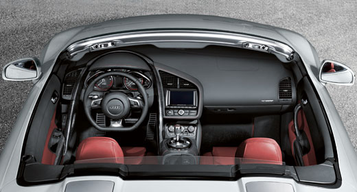 Im Innenraum bietet der offene Zweisitzer von Audi großzügige Platzverhältnisse. Das dreispeichige Multifunktions-Sportlederlenkrad hat einen unten abgeflachten Kranz, wie in einem Rennwagen, und die tief montierten, elektrisch einstellbaren Sitze führen und unterstützen den Körper perfekt.