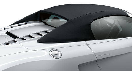 Wie jeder offene Audi hat der R8 Spyder 5.2 FSI quattro ein Verdeck aus Stoff – eine konsequente Lösung für einen Hochleistungsportwagen. Das Softtop wiegt nur etwa 30 Kilogramm und hält so das Gesamtgewicht und den Fahrzeugschwerpunkt niedrig. Es nimmt in geöffnetem Zustand wenig Platz in Anspruch; geschlossen fügt es sich harmonisch in die Designlinie ein. Es läuft in zwei schlanken Finnen aus, die sich zum Heckabschluss ziehen, und dabei die gestreckte Silhouette betonen.