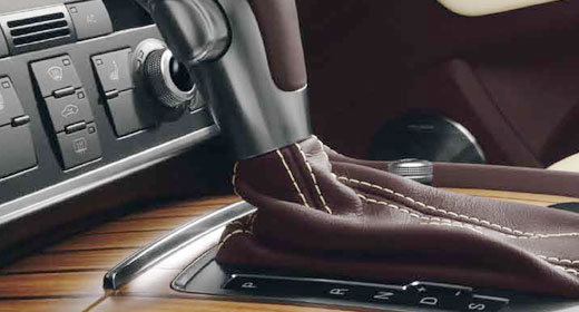 Wählhebelmanschette in maronenbraun mit Kontrastnähten in alabasterweiß