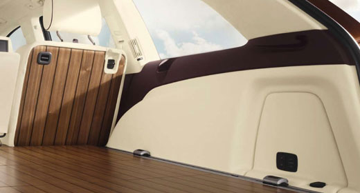 Lehnenabdeckung der Rücksitze und Kofferraumboden in amerikanischem Nussbaum mit Einlagen in Räuchereiche