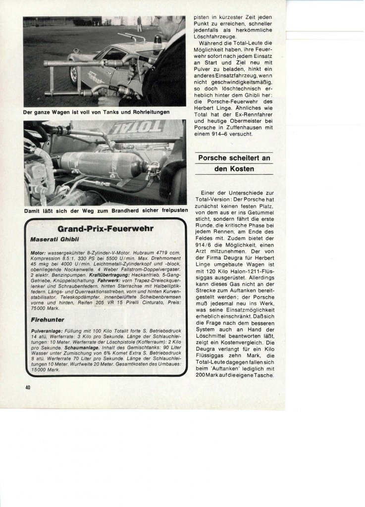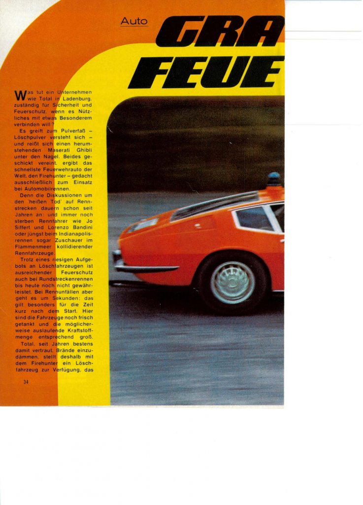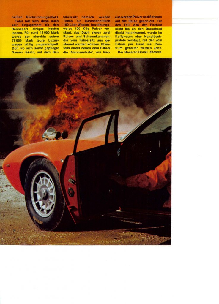 anbei ein Bild mit einem Maserati Ghibli beim Umfall 1978 in Monza und ein Bericht über den Ghibli Firehunter.