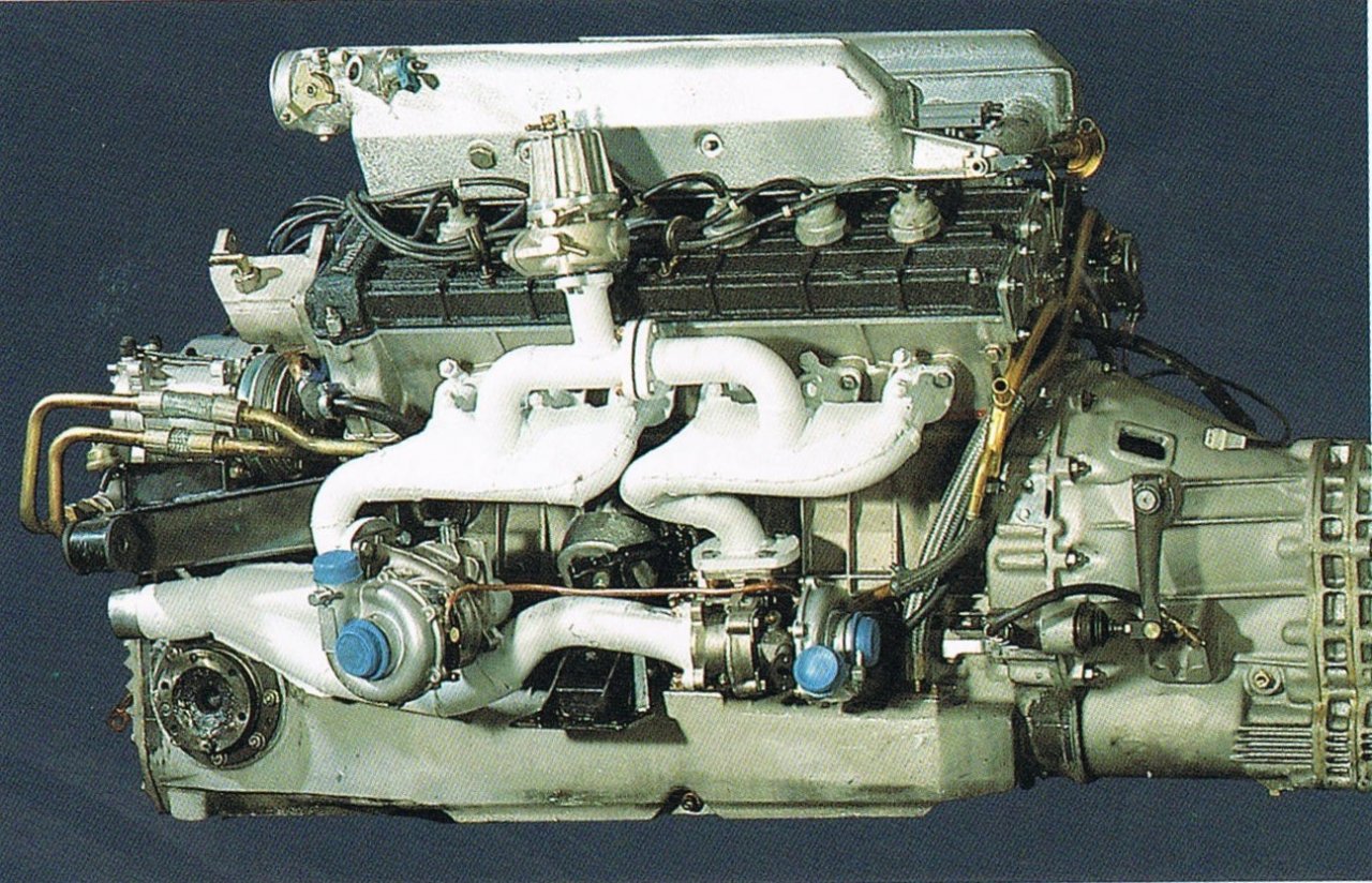 Das erste Bild vom ausgebauten Motor sehe ich zum ersten Mal, wobei das so im Motorraum kein Platz hatte, man sieht noch die originalen Einspritzer-Kollektoren wie sie später auch beim Diablo Serie wurden, die Turbos wurden dann ja nach oben verlegt.