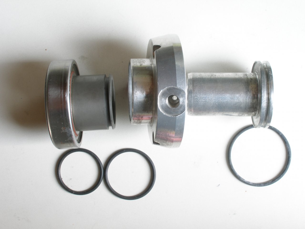 zwischenzeitlich habe ich einen konzentrischen Kupplungsnehmerzylinder (CSC) eines unbekannten Herstellers von einer befreundeten Werkstatt bekommen. Bild 1 zeigt den CSC. In Bild 2 ist der CSC zerlegt. Links das Drucklager, montiert auf dem Kolben, in der Mitte das Grundgehäuse und rechts das Führungsrohr, darunter die Dichtringe.