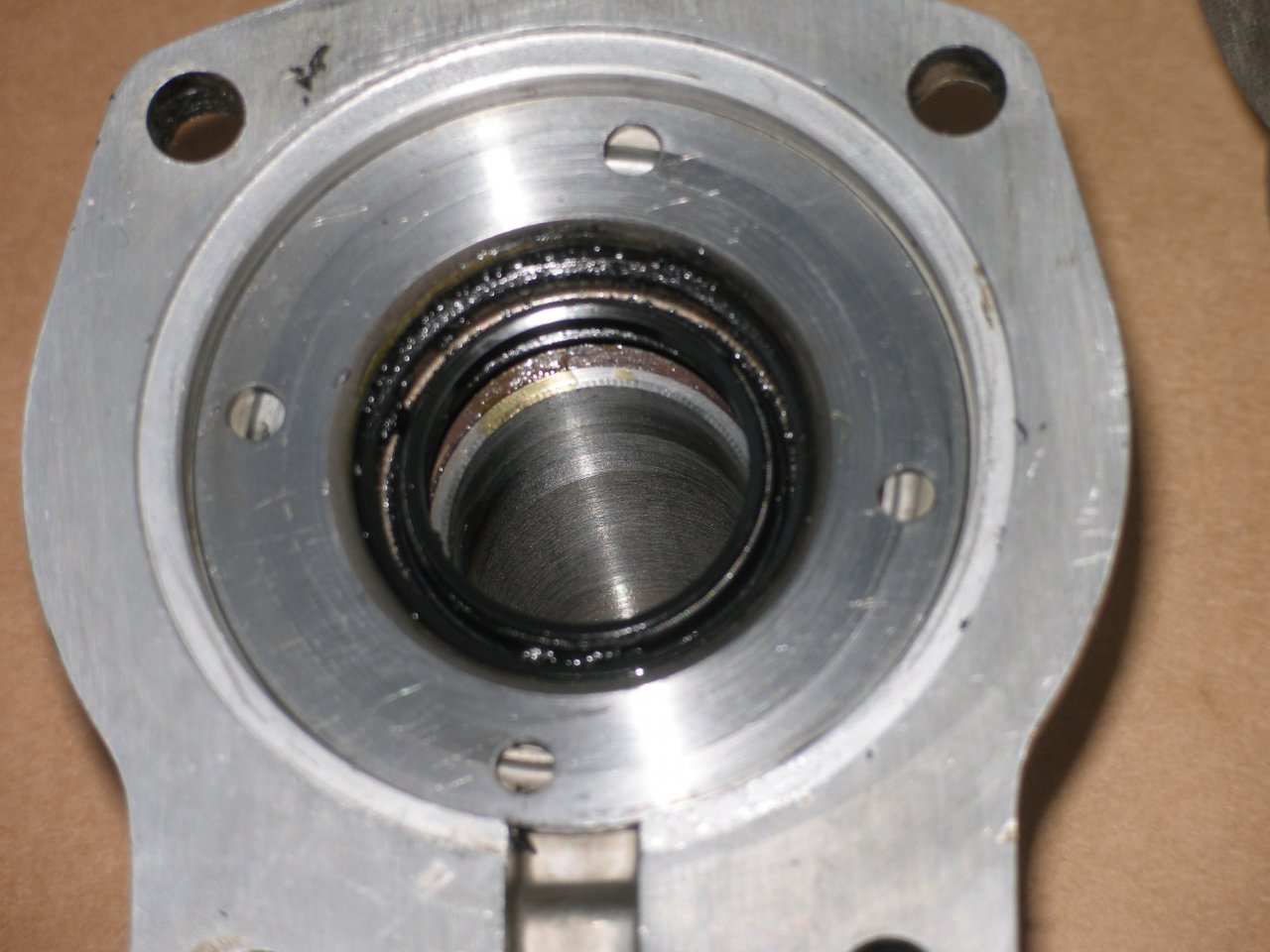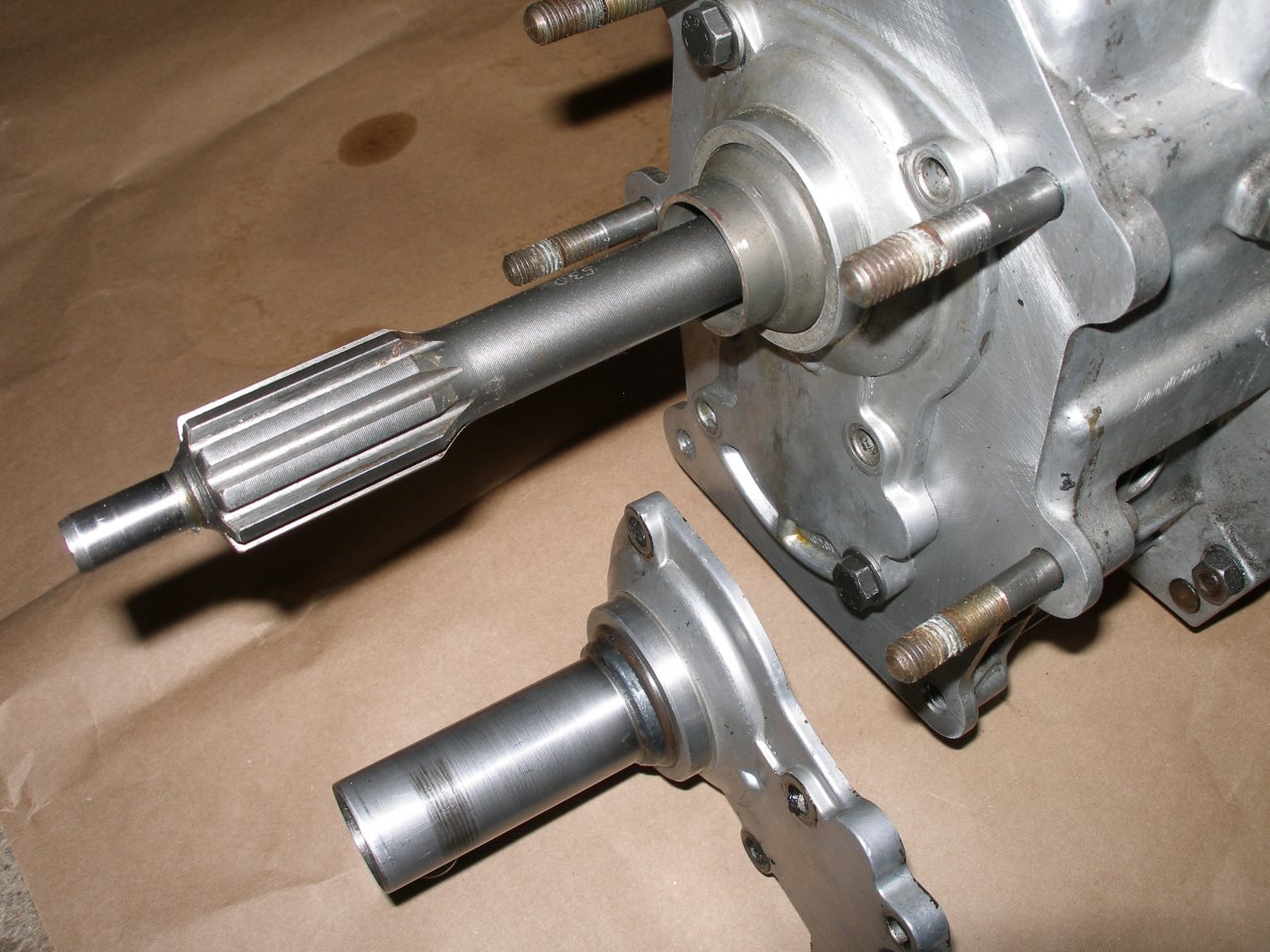 Wie oben beschrieben, sollte jetzt das Führungsrohr des Ausrücklagers entfernt werden. Schraubt man die Frontplatte ab, stellt man allerdings fest, das Führungsrohr trägt den Wellendichtring (Bild 1). Um die Ortiginalteile nicht anzutasten, habe ich Ersatzteile besorgt, und das Ersatzführungsrohr gekürzt. Bild zwei zeigt Ersatz- und das Originalteil. Als nächstes müßte der Abstand von der Tellerfeder zur Planfläche am Getriebe gemessen werden. Das wird sich etwas verzögern, da mein Motor zur Revision ist. Brunoooooo, ........... . Die Zeit vertreibe ich mir mit Gartenarbeit.