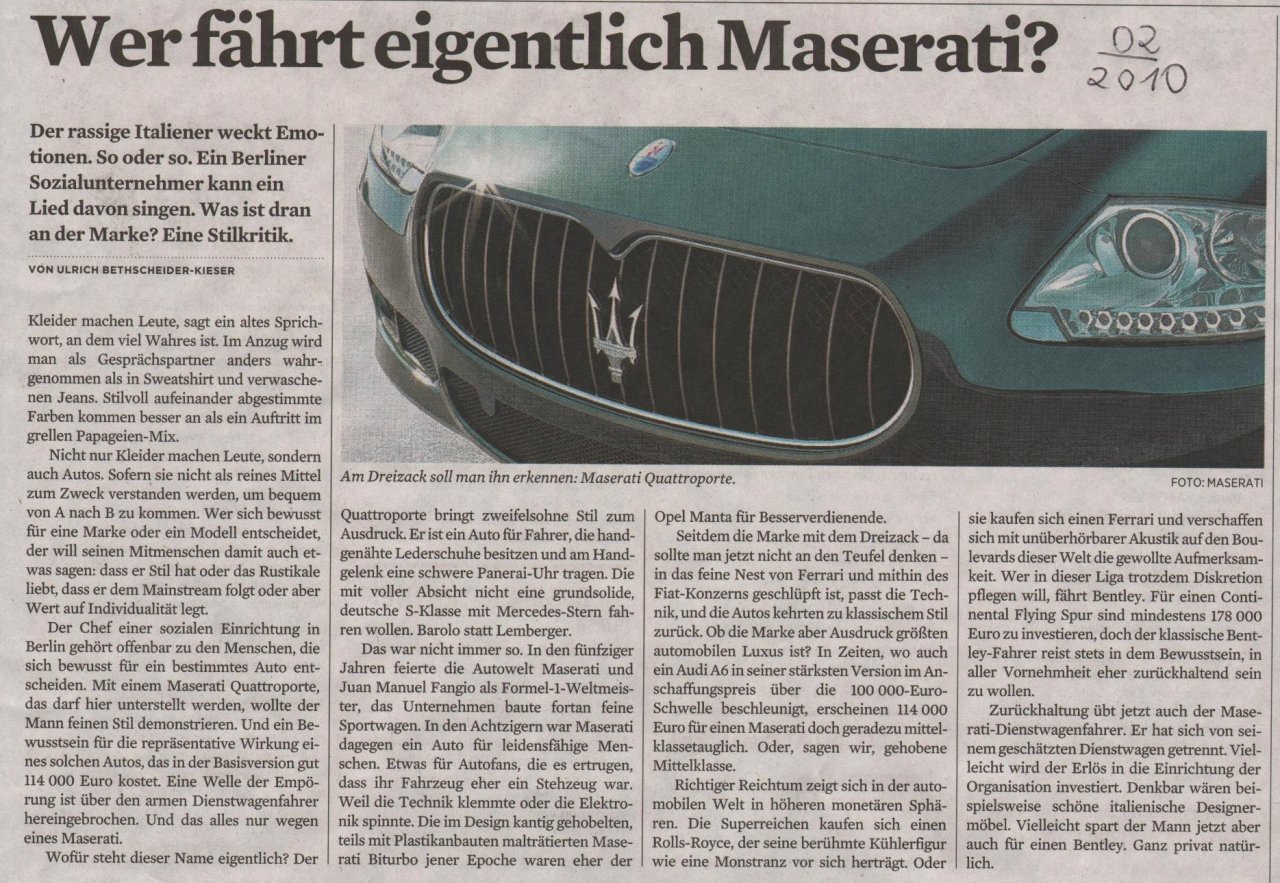 Ich finde das beide Standpunkte hier ihre Berechtigung haben. Auf der einen Seite ist es eben etwas irritierend, dass ein solches Fahrzeug zum Fuhrpark einer Obdachlosenhilfe gehört, denn an und für sich hat Wohltätigkeit ja auch immer etwas mit Verzicht zu tun, auf der anderen Seite muss man auch sagen, dass, wer etwas leistet, sich auch etwas gönnen darf. Allerdings ist es zweifelhaft, ob jemand, der ohnehin schon ein großes Vermögen aufgebaut hat und privat im Luxus lebt, dann unbedingt noch als Firmenwagen einen Maserati braucht, vor allem in diesem Geschäftsbereich. Man muss ja auch immer aufs Firmenimage schauen und in der Hinsicht hätte es ein Fahrzeug mit kleinerer Hausnummer wohl auch getan. Ich denke aber, dass man ihm das Fahrzeug im großen und ganzen nicht absprechen kann.