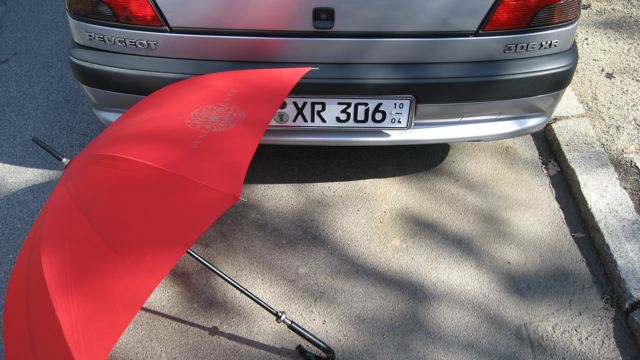 Da ich der Meinung bin, daß der Schirm auch immer zum Auto passen sollte und umgekehrt, war es nachgerade unumgänglich, diesen Schirm in einem Auto französischer Provinienz zu deponieren.