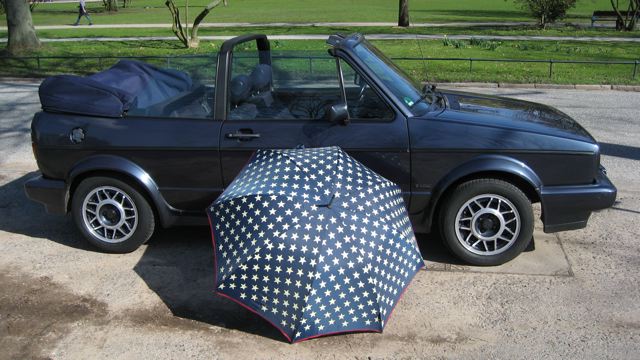 Vor ca. zehn Jahren war ich für ein verlängertes Wochenende auf der Insel, die das Long Island der Hamburger ist und das Wetter war völlig anders als angesagt, unter anderem mußte auch ein Schirm her, der seitdem natürlich in diesem Auto lagert.