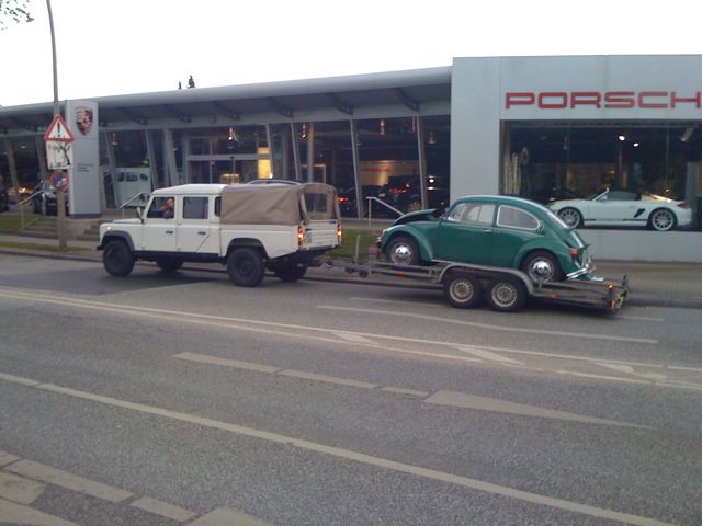 Ich möchte doch der geneigten Leserschaft dieses Threads mitteilen, daß ich das Käferchen in der vergangenen Woche mit einem doch recht stilvollen Zugfahrzeug nach Berlin geholt habe (s.u.), meine Werkstatt hat den Wagen ausgiebig untersucht, leider mit dem Ergebnis, daß er so stark verzogen und gestaucht ist, daß eine Reparatur nicht nur wirtschaftlich sinnlos wäre (was jetzt nicht so sehr das Problem wäre), sondern auch technisch zu aufwendig und vom Ergebnis her nicht zufriedenstellend.