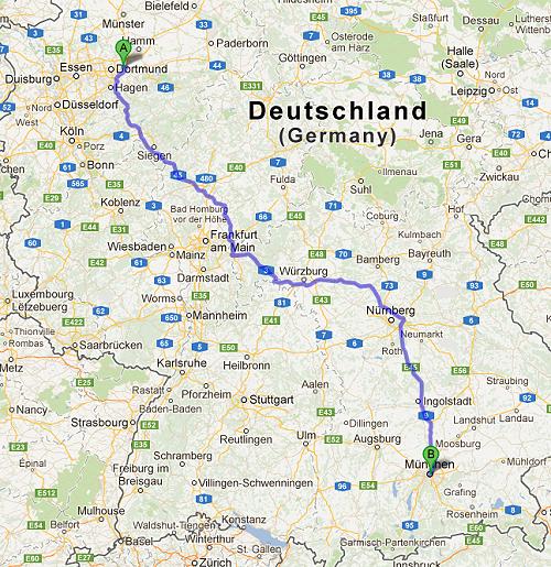Nach einer Einweisung (insbesondere in die Geheimnisse des Tankdeckels) und herzlicher Verabschiedung ging es los auf die Etappe Dortmund - München. Öl war frisch gewechselt, Kühlwasser und Reifendruck nachgesehen, so sollte alles reibungslos laufen: