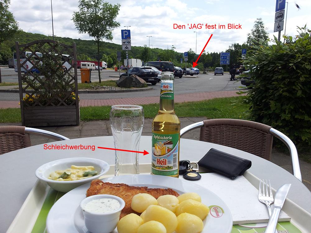 Mittagessen auf der romantischen X-) Terrasse einer Raststätte. Aber den Jag immer fest im Blick. Lustig, wie sich eine Jugendauswahl des BVB um den Wagen versammelt - das Auto kommt heute wieder "an".