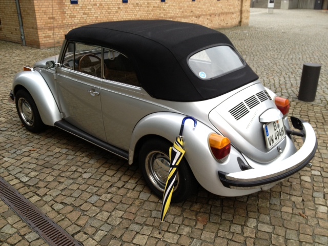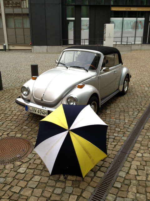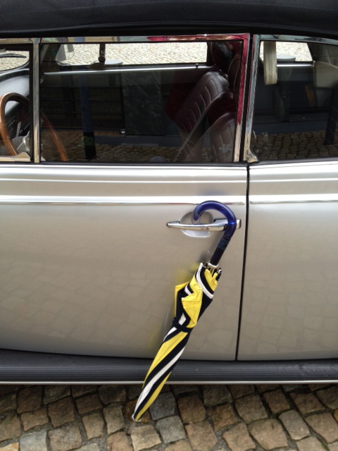 Die Besitzerin des Autos ist eine ebenso liebenswerte wie modeaffine Freundin, deshalb hat sie natürlich einen wunderbar die Farben des Sommers wiederspiegelnden Schirm in ihrem herrlichen Sommerauto, einen Schirm von Zegna, in dessen Regendach das Weiß des Strandes, das Gelb der Sonne und das Blau des Meeres zu finden ist, was hervorragend paßt, da die Dame Cabriolet so oft wie möglich in Richtung Küste steuert!