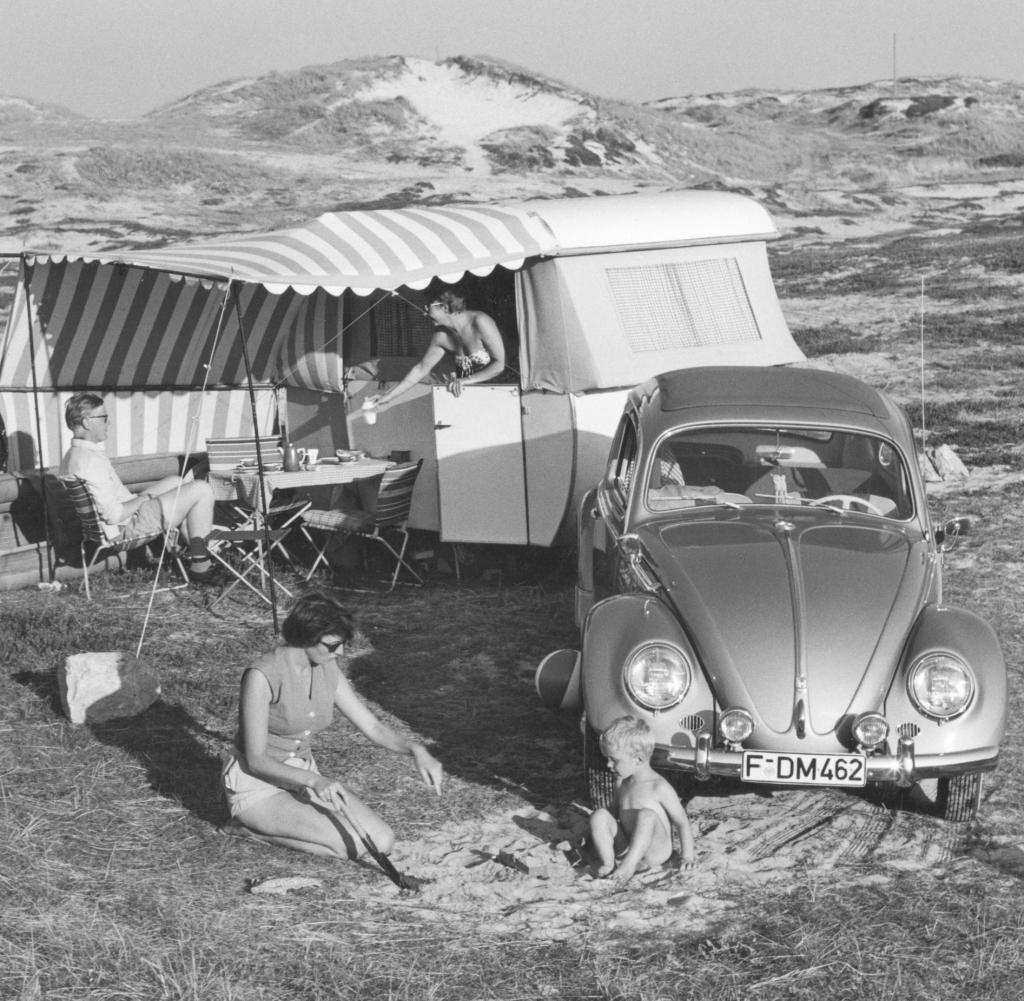 Famillie Servatius mit einem geliehenen Käfer beim Dünencamping
