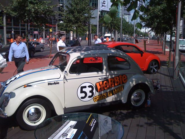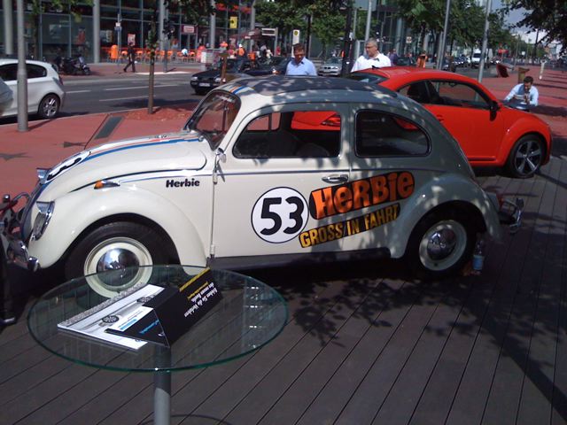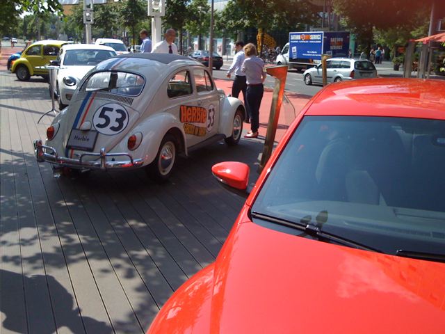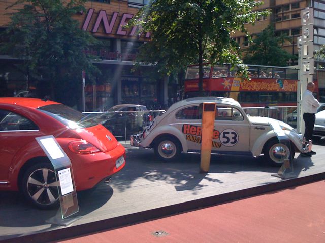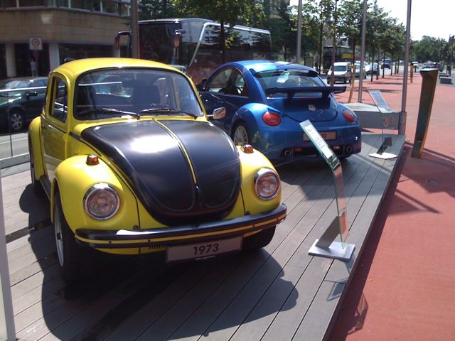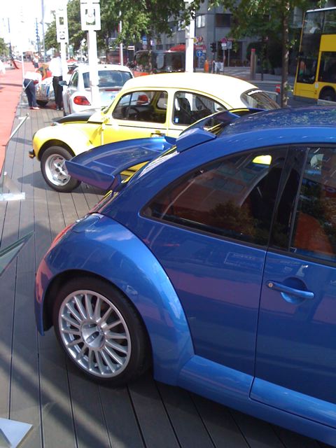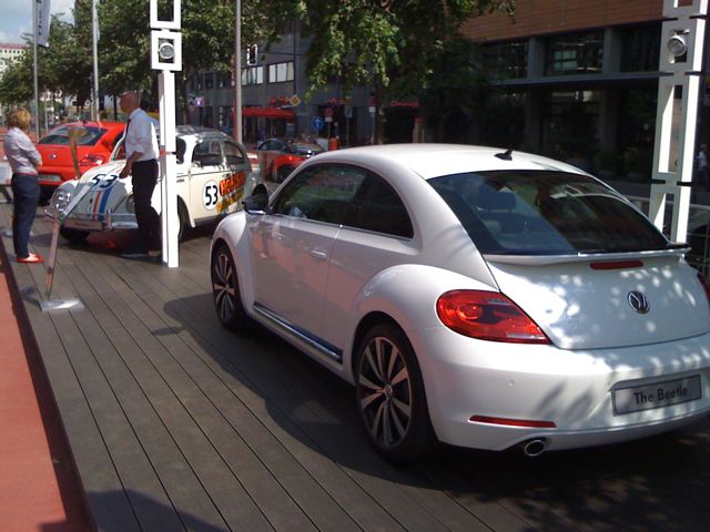 Hier präsentiert VW den neuen New Beetle, ein nicht weniger albernes Auto als sein Vorgänger, aber die "Ahnenreihe" ist doch recht nett: