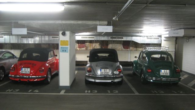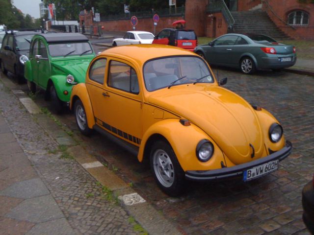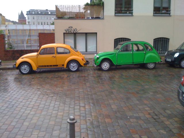 Kreuzberg goes Seventies, orangefarbener Jeans-Käfer und grasgrüne Ente sieht man selten zusammen...