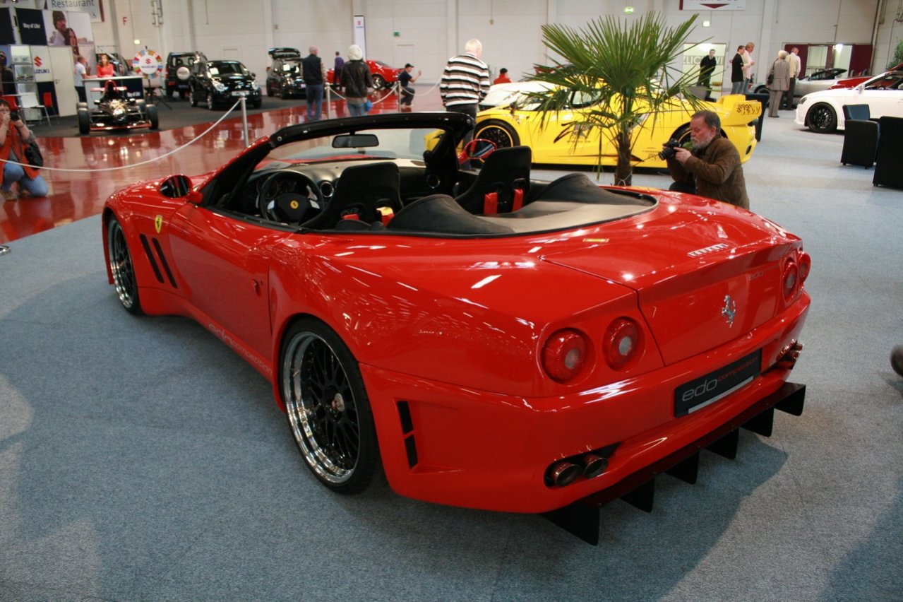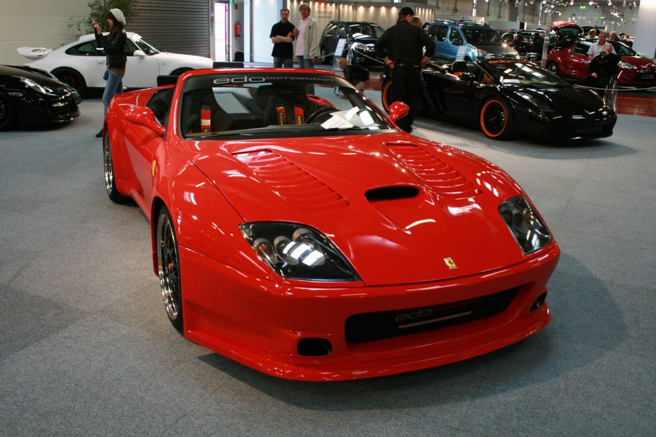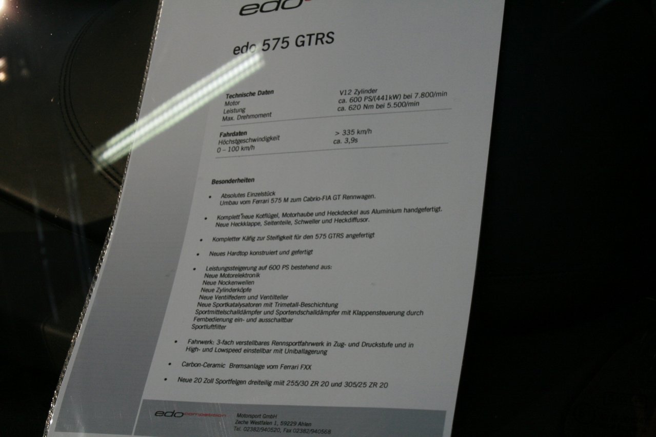 Ein roter Ferrari 550/575 (?), anscheinend ein Megabreitbau, schwarze Felgen mit Zentralverschluss, gekürztes Heck, Schalensitze wie im Porsche GT3, 12 (!) Schuhkartongrosse Lüftungsöffnungen in der Motorhaube, Riesendiffuso und Zugelassen im Zulassungsbezirk WAF und EDO Competition auf der Seite stehen.