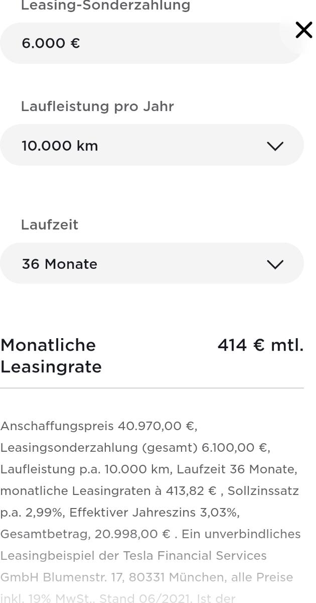 Okay versuchen wir mal das auf echte Zahlen zu stellen. 6.000,- Euro Innovationsprämie + die 570,- Euro Steuer von der Herstellerförderung ergeben 6.570,- Euro brutto Förderung. Macht beim Tesla Model 3 eine Monatsrate bei 36 Monaten von 397,- Euro.