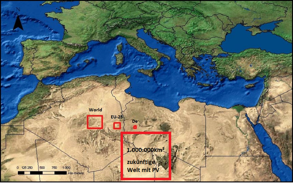 Die notwendigen Flächen der Solarzellen kann man jetzt einfach berechnen. Für die Welt benötigen wir 30.000.000.000.000 kWh im Jahr, da ein Quadratmeter eine Einstrahlung von 2000 kWh hat wären das theoretisch 15.000.000.000 m² oder 15.000 km².26.03.2017