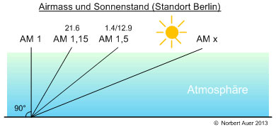 Die Zusammensetzung des Sonnenspektrums, die Sonnenscheindauer und der Winkel, unter dem die Sonnenstrahlen auf die Erdoberfläche fallen, sind abhängig von Uhrzeit, Jahreszeit und Breitengrad. Damit unterscheidet sich auch die eingestrahlte Energie. Diese beträgt beispielsweise etwa 1.000 kWh pro Quadratmeter und Jahr in Mitteleuropa und etwa 2.350 kWh pro Quadratmeter und Jahr in der Sahara.