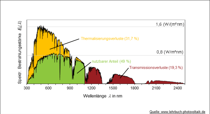 Nur ein Teil der Lichtquanten aus dem Spektrum der Solareinstrahlung weist allerdings die zur Überwindung der Bandlücke nötige Energie bzw. die richtige Wellenlänge auf. Vorrangig sind das die Leichtteilchen im sichtbaren und niedrigen infraroten Spektrum (c-Si-Standardzellen beispielsweise nutzen Wellenlängen zwischen 400 bis 1.150 nm mit der größten Ausbeute zwischen 600-900 nm).