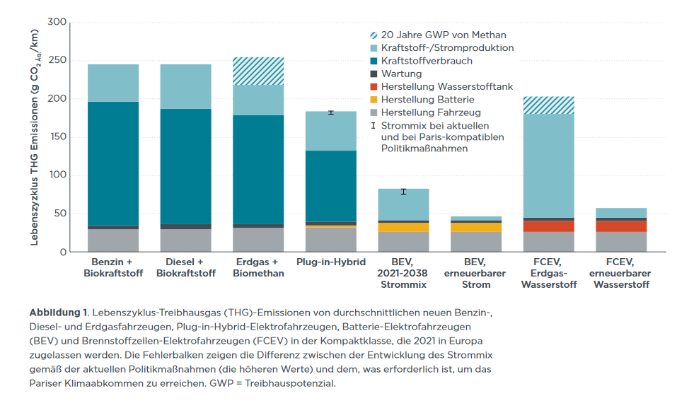 Die Produktion von Wasserstoff mit Erdgas macht den dicken Balken aus. Da es dabei kaum einen Wirkungsgrad von 100% geben wird und zudem die Entropie es gar nicht mag den thermodynamischen Berg hochgeschoben zu werden, wird für die Erzeugung eines Energieäquivalentes Wasserstoff mehr CO2 emittiert als bei einem normalen Verbrenner im Betrieb. Auch das scheint plausibel.