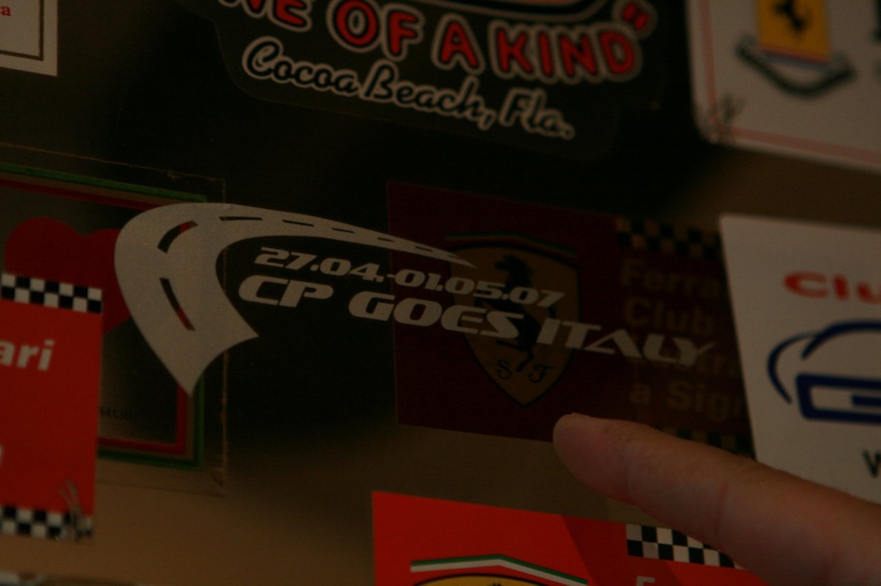 Auf dem Hotelparkplatz konnte man schließlich kurz vor Abfahrt zum Einen die neuesten Schuheinkäufe einiger Tourteilnehmer bewundern und zum anderen fleißigen Putzteufeln bei der Arbeit zusehen, immerhin hatte sich ein italienischer Vogel dazu berufen gefühlt, dem einzigen italienischen Auto der Gruppe seinen Stempel aufzusetzen.