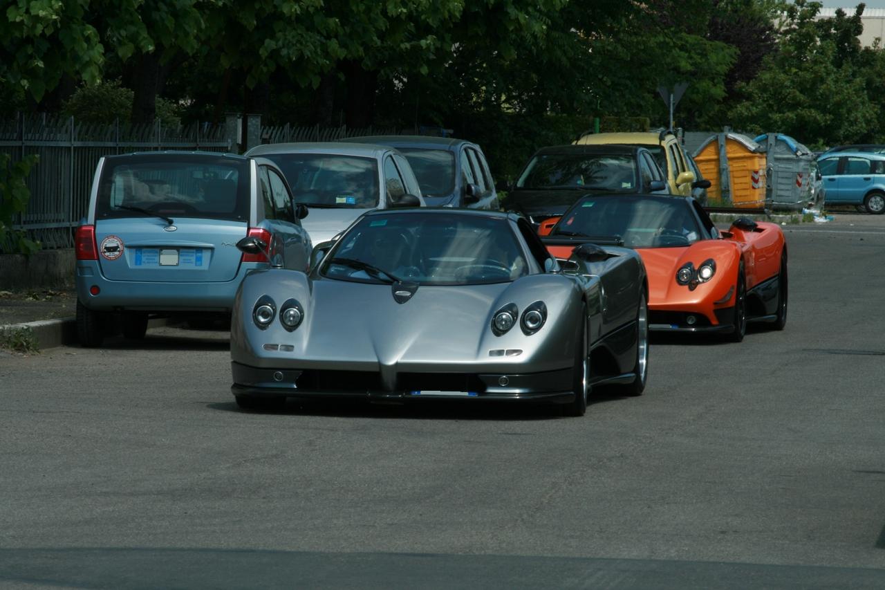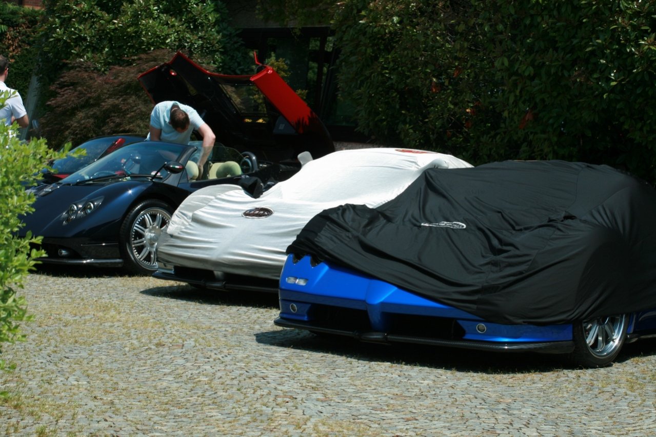 Dann hatten wir gerade das neue Pagani Einzelstück, den Zonda Uno neben der Halle entdeckt, als es hinter uns lautstark rumorte. Erster Gedanke: "Geil, da kommt noch einer!" Umgedreht, Kinnlade am Boden. Nein, nicht einer, da kamen gleich zwei weitere Zonda ums Eck. Zum einen ein Zonda S Roadster und zum anderen ein Zonda F, der auf Wunsch seines Besitzers mit einigen Teilen des Cinque ausgerüstet wurde.
