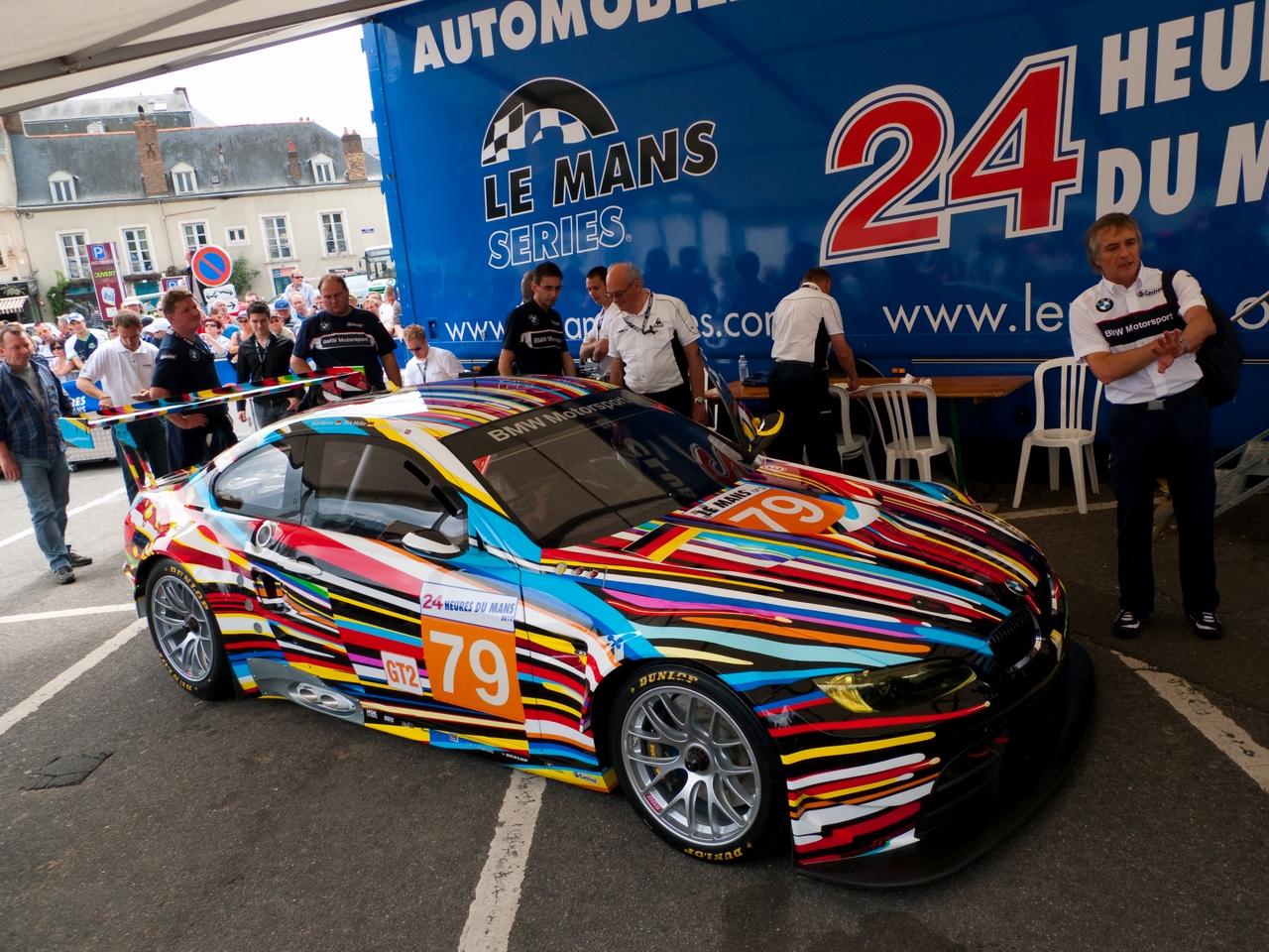 Leider hat das Art Car kein Glück gehabt. Erst gab es zwei Reifenschäden und dann blieb Andy Priaulx in der Nacht trotz anderen Berechnungen offenbar ohne Sprit liegen. Anders als beim 24h Rennen am Nürburgring ist es in Le Mans nicht gestattet, sich irgendwo Sprit zu besorgen, um an die Box zu gelangen. Einzig der Fahrer darf am Auto arbeiten und das auch nur mit den Mitteln, die bereits an Bord sind. Sobald er sich 10 Meter vom Auto wegbewegt ist Feierabend. BMW hat alles probiert, Andy ist sogar einige Meter nur mit dem Startermotor gefahren, aber alles in allem war man zu weit weg von der Box und musste leider aufgeben. Eine genaue Fehleranalyse ist erst möglich, wenn das Auto zurück in der Garage ist, was noch nicht das Fall ist.