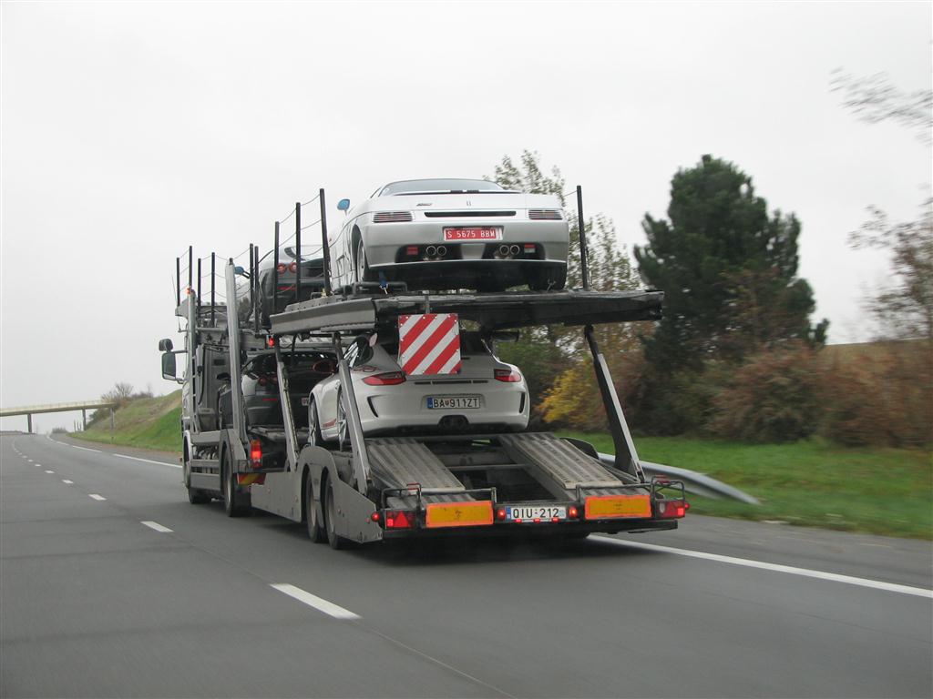 Gestern in Frankreich. Transporter mit 2 x Scuderias, einen Porsche xx und das Ding oben darauf.