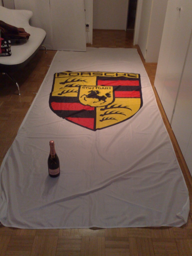 Infolge des Umzuges einer Porsche-Niederlassung in neue Räumlichkeiten wurde ein Teil der Werbemittel an Kunden vergeben, so auch dieses riesige Banner. Das sehr hochwertige, edel schimmernde und überaus robuste Material nennt sich "VP-Plus" und ist maschinenwasch- und bügelbar.