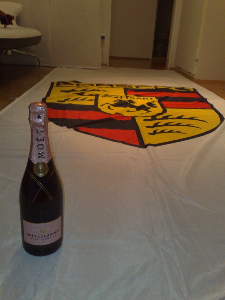 Auf dem Bildern sieht man z.T. eine 0,75l-Champagnerflasche, nur um einmal die Dimension des Banners klarzustellen. Der Schampus ist übrigens nicht Bestandteil der Auktion, den haben wir schon gefrühstückt. Leider.