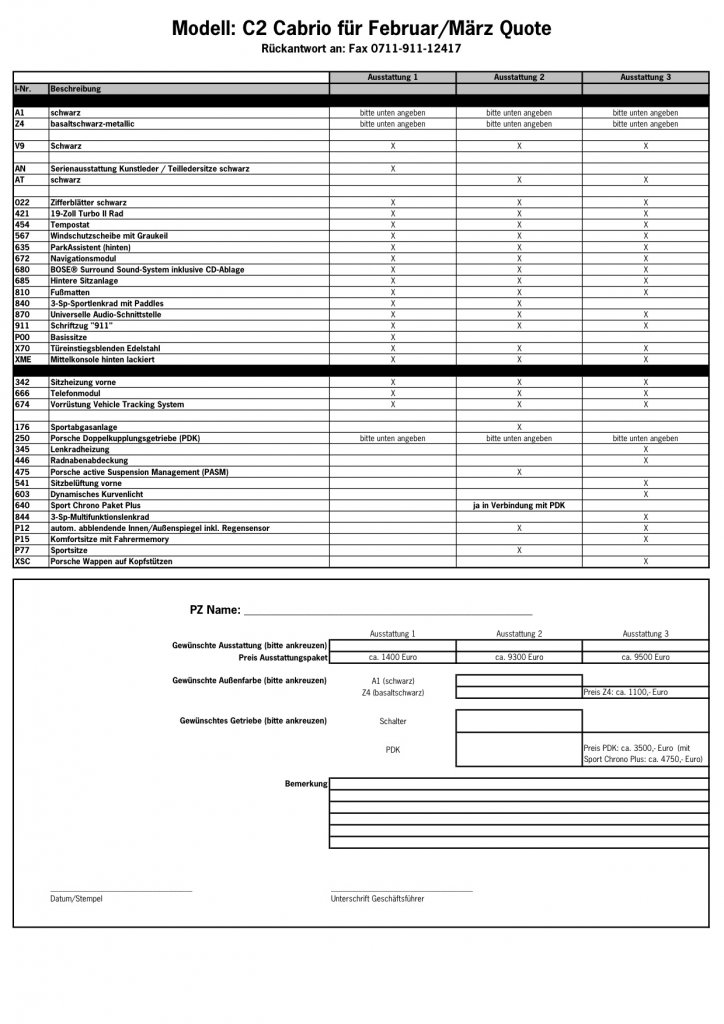 sorry das ich nichts preisgeben kann und will - aber in den PZ`s werden gerade die Quoten abgefragt. Ich steh grad vor der Entscheidung mir einen 997 zu switchen. Ich würde einfach mal beim PZ Eures Vertrauens das Wort "Black Edition" beiläufig erwähnen - ich denke da bleiben dann einige Gesichter stehen sowie bei meinem Verkäufer und nach kurzem stammeln dann die Nachricht das bereits schon paar geordert wurden und ich natürlich einen davon auch haben kann wenn ich möchte aber erst im März 2011. Ich denke das die PAG die nächsten 14 Tage die neue Edition offiziell kundtut. Aber wie gesagt nur für die C2... Das Leasing dürfte dann ohne Anzahlung bei ca. 1000,- EUR brutto liegen.