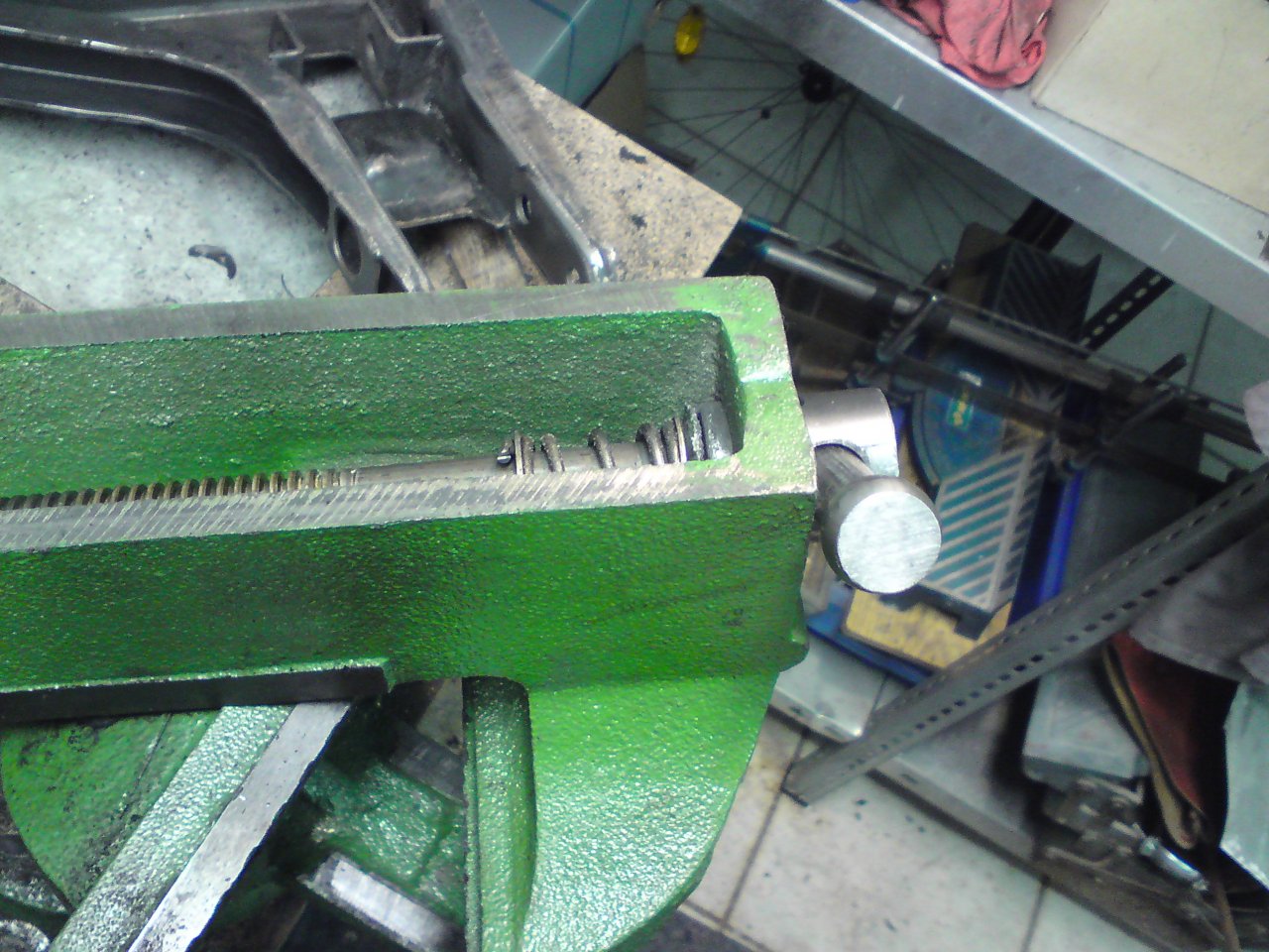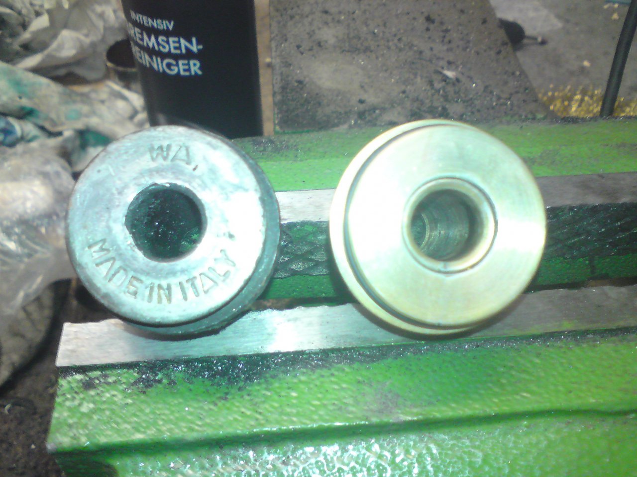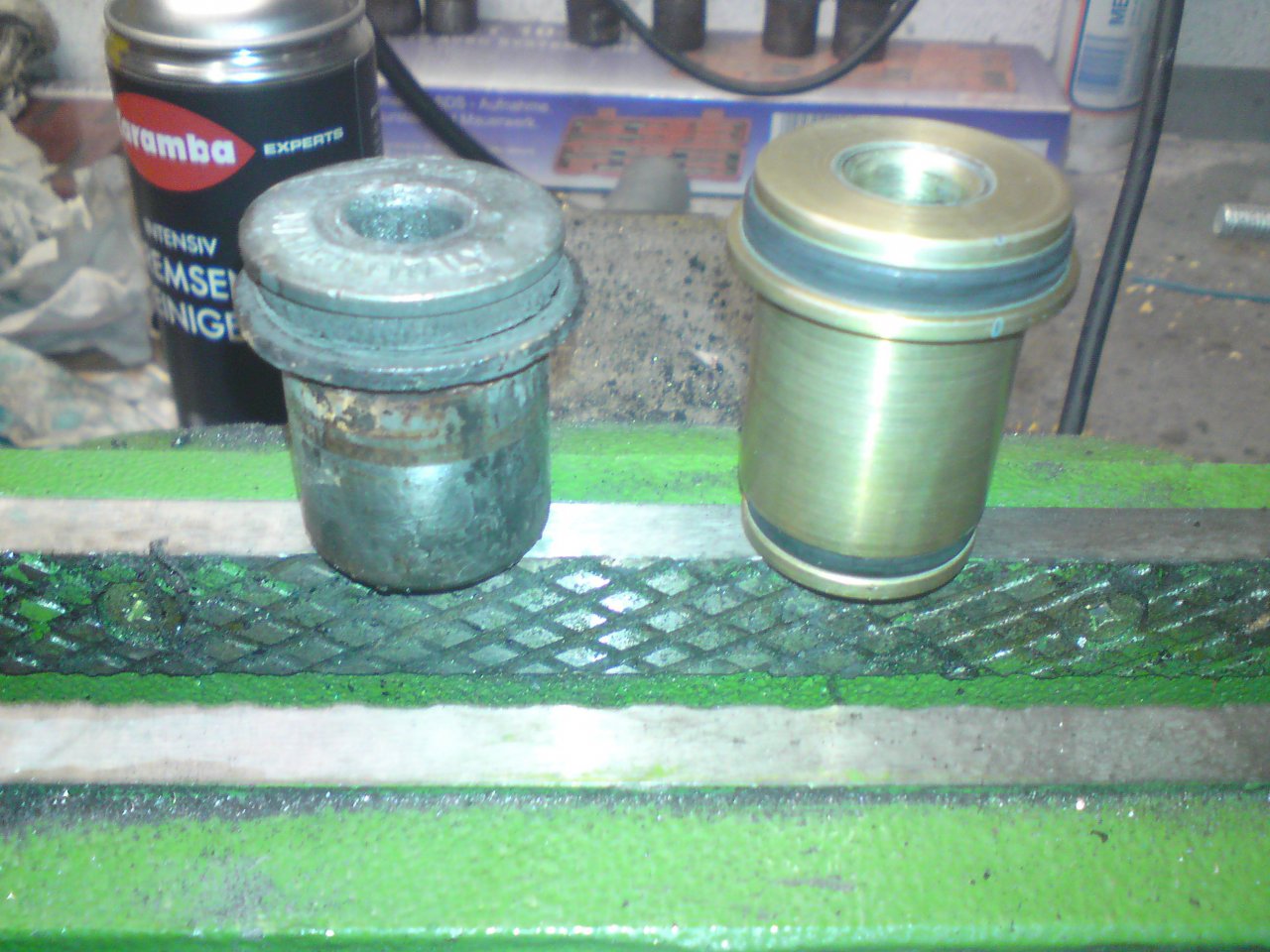Die alten Buchsen waren an meinem Fahrzeug nicht angepunktet, aber saßen wirklich sehr fest, Nach ca. der Hälfte an Pressarbeiten kapitulierte mein Schraubstock ( hatte Ihn erst vor 8 Wochen gekauft, Reklamiert und neuen erhalten).post-82909-14435364022544_thumb.jpg