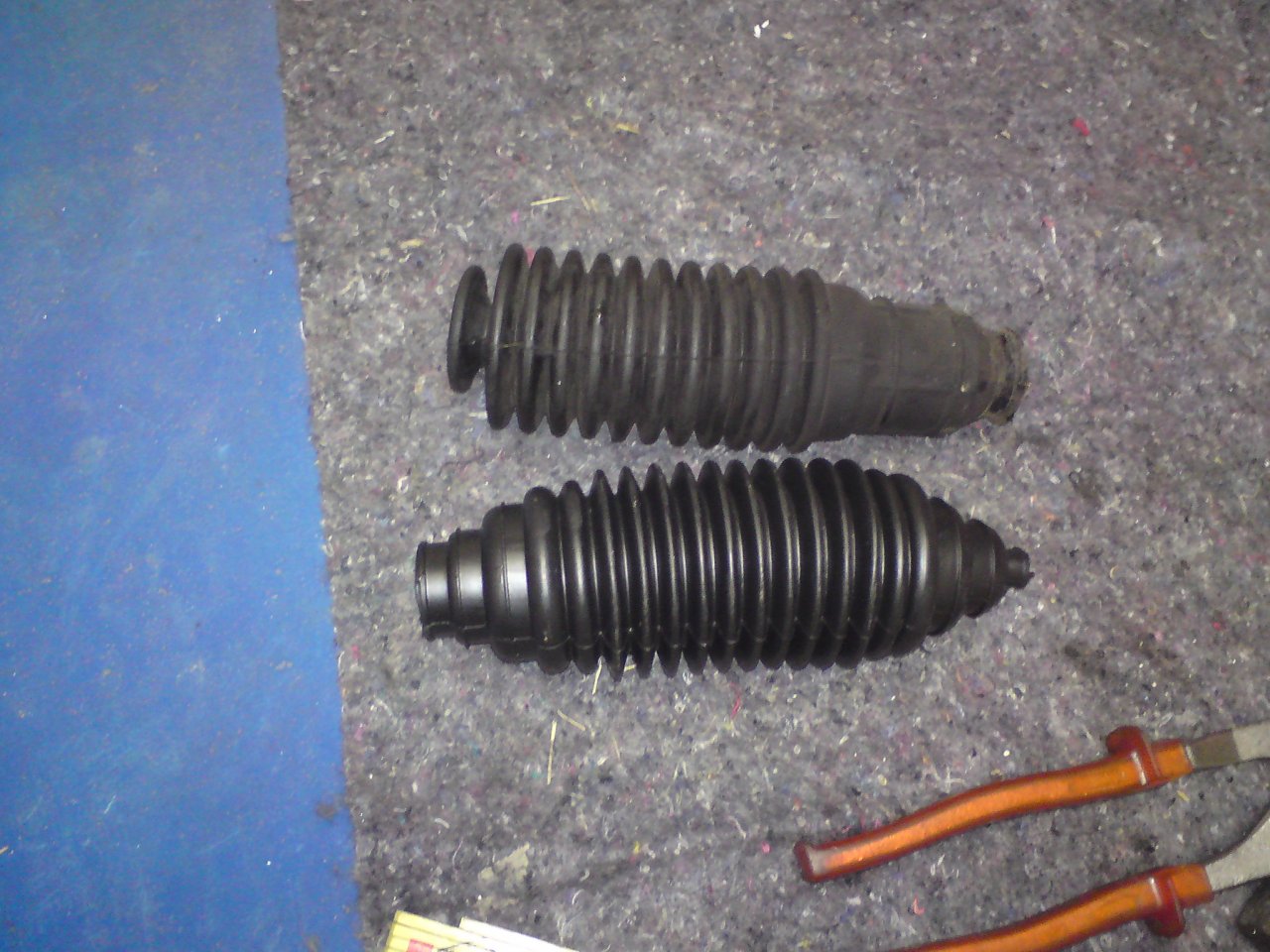 Problematisch ist auch der Ausbau der vorderen Spurstange, ich bin der Meinung daß bei Fahrzeugen mit Klimaanlage(meine ist ausgebaut, brauch ich nicht, geht aufs Leistungsgewicht :-) )ohne Demontage einiger Klimaschäuche die Demontage schlicht unmöglich ist. Wenn man diese Arbeit auf sich nimmt sollte man wirklich bei dieser Gelegenheit die Faltenbälge der Lenkung genauestens überprüfen oder austauschen, so gut wie in diesem Zustand kommt man da nicht mehr dran.