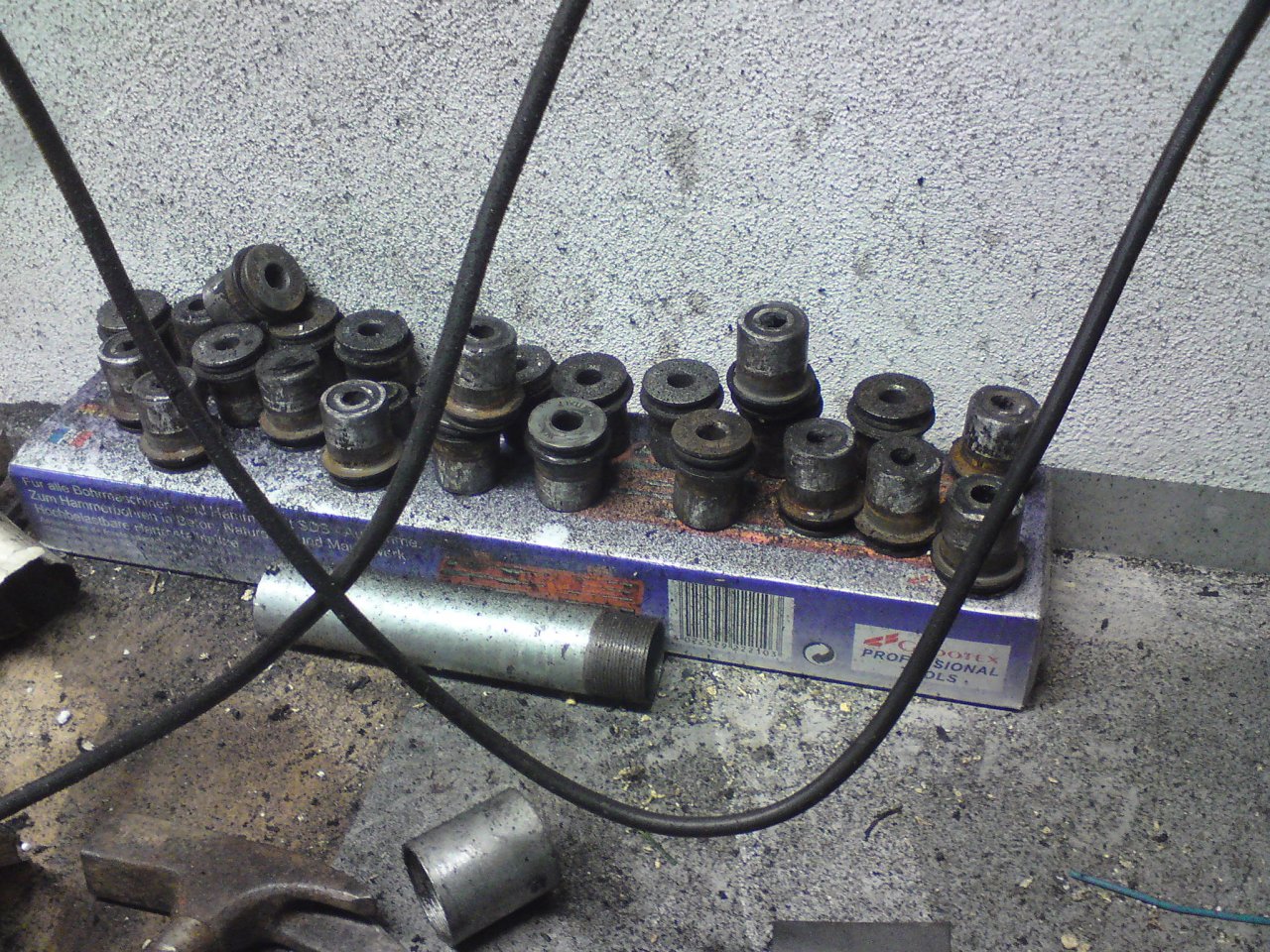 Ich habe versucht das auspressen soweit wie möglich zu erleichtern indem ich die alte Farbe(aus einer früheren Restaurationsaktion)mit dem Dremel entfernt hatte, die alten Buchsen mit WD 40 "eingeweicht" hatte, und bei besonders hartnäckigen Buchsen mit dem Heißluftfön die entsprechenden Stellen erhitzt habe.