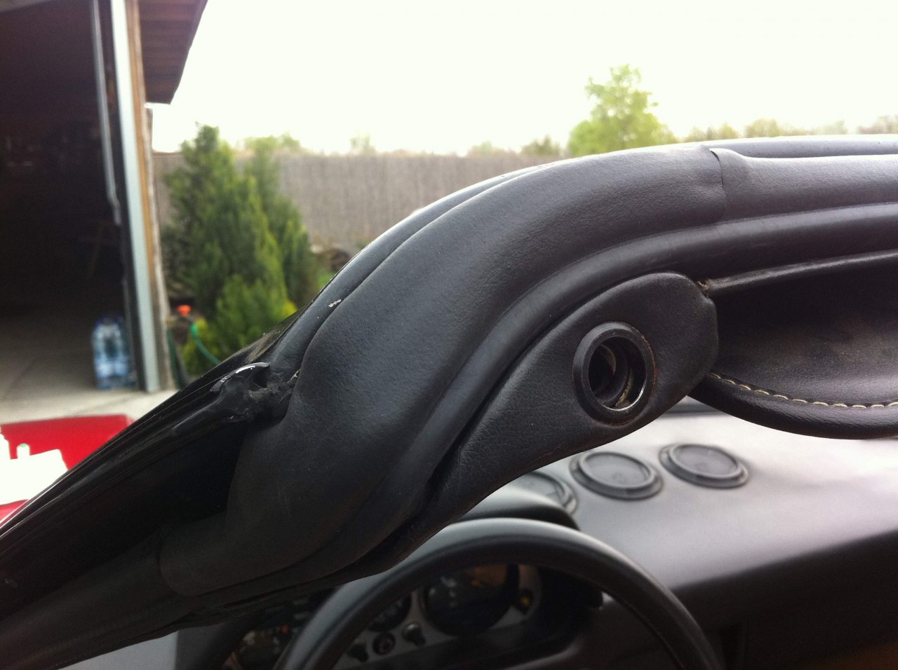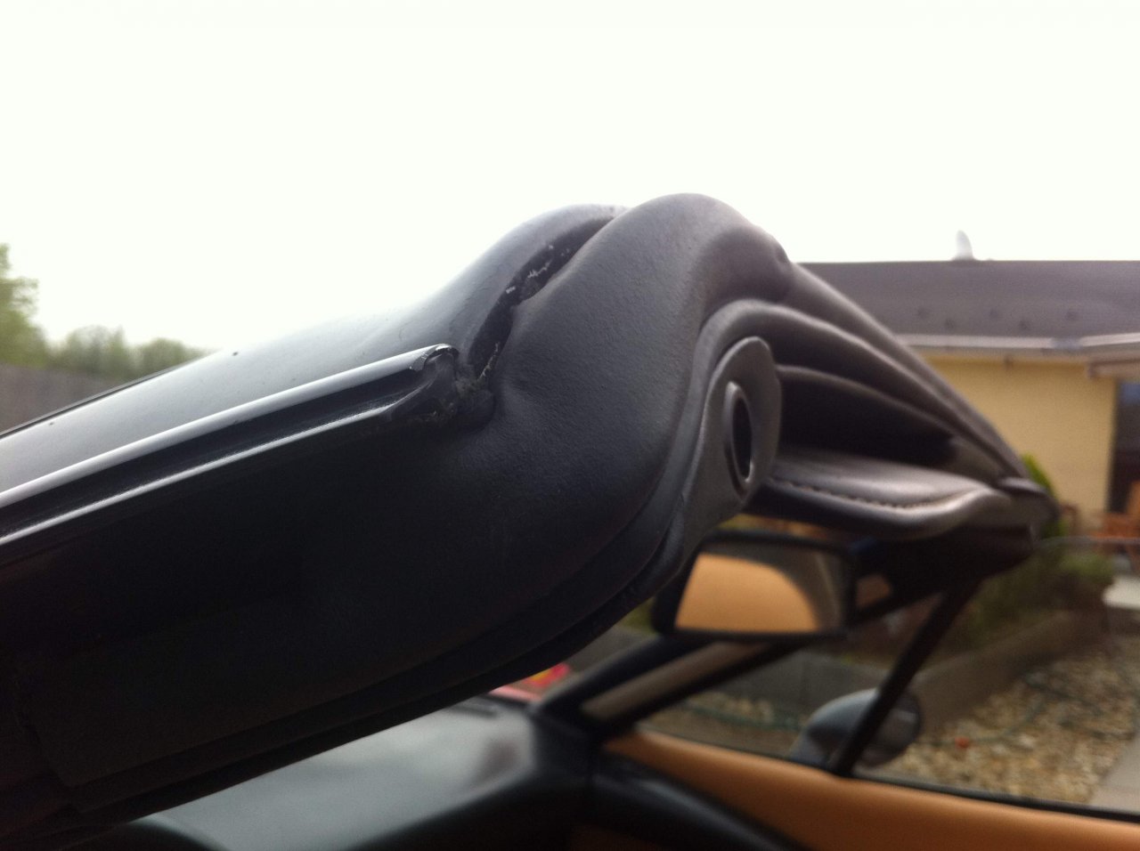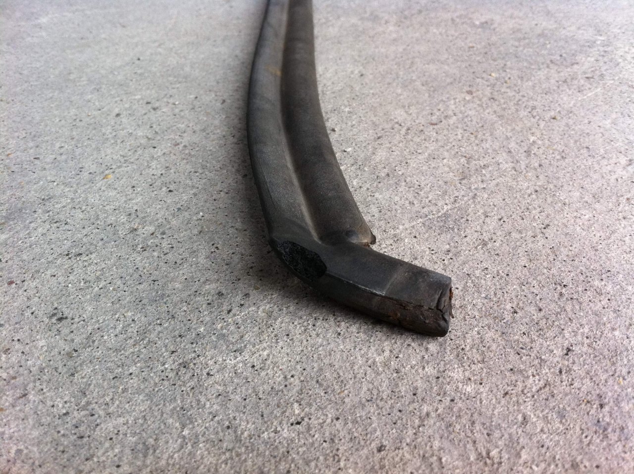 2. Eine alte Fiat oder Lada Türdichtung, der aber 100%ig im mass passt, nur die Laenge muss man wieder gut schneiden, auf der Kante ringsherum raufdrücken. An die Ecken kann man den gut fast eckig biegen. Dann wieder die Ecken abziehen, und die innere Seite des Gummibogens ganz unten aufmerksam, auf die Saeulenstuck etwa 6 cm lang, auf dem dachstück 10-12 cm aufschneiden.