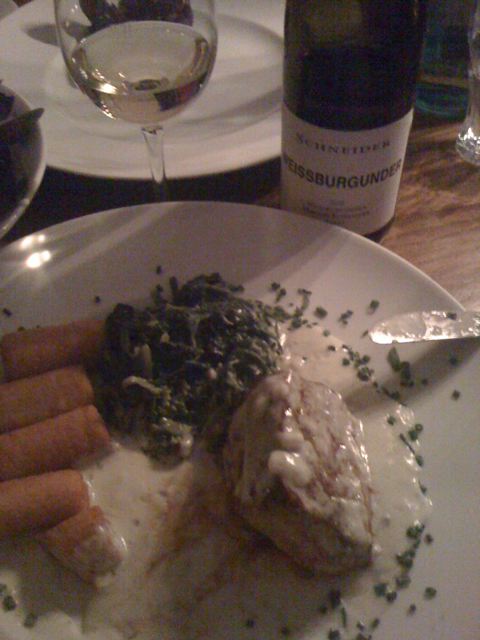 Da ich Sie als strikten Abstinenzler kenne, erleichterte mich Ihre Randnotiz ungemein, wonach der zum Essen abgebildete Wein nur zu Dokumentationszwecken vom Nachbartische ausgeliehen sei. Sollte Ihnen der Winzer tatsächlich unbekannt sein, so sei doch der Hinweis verstattet, daß Herr Markus Schneider einen recht ergötzlichen Weißburgunder keltert.