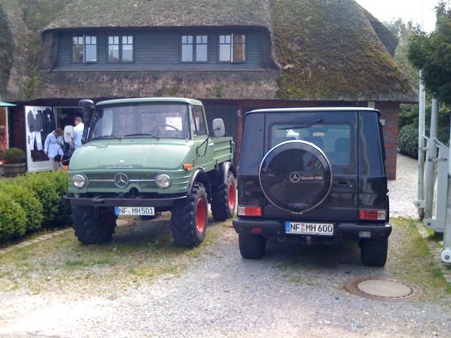 Unkonventionelle Fortbewegungsmittel gibt es dort aber noch andere, besonders gut gefallen haben mir diese beiden Mercedes-Geländewagen eines Kampener Makler, ich frage mich, was er mit dem Grünen anstellt...