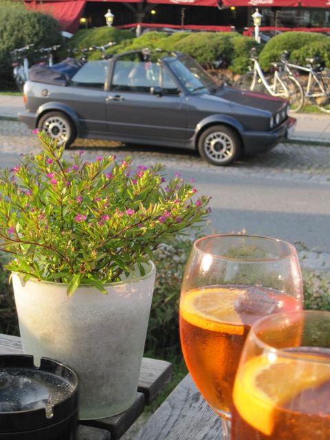 Gesagt, getan, der blaue Klaus, unser 22 Jahre alter Wagen für die weiten und schnellen Fahrten zwischen Berlin und Bergamo wurde gewaschen und mit Ölzeug, Gummistiefeln, Badekleidung und Sonnenöl beladen und wir preschten von Berlin nach Niebüll, die letzten Kilometer von der Autobahn bis zur Zugverladung entsprachen nicht ganz den Vorstellungen der StVO, ich entschuldige mich hiermit bei allen Verkehrsteilnehmern, die sich über das kleine blaue Cabriolet aus Berlin aufgeregt haben, aber wir wollten unbedingt zum Abendessen da sein...