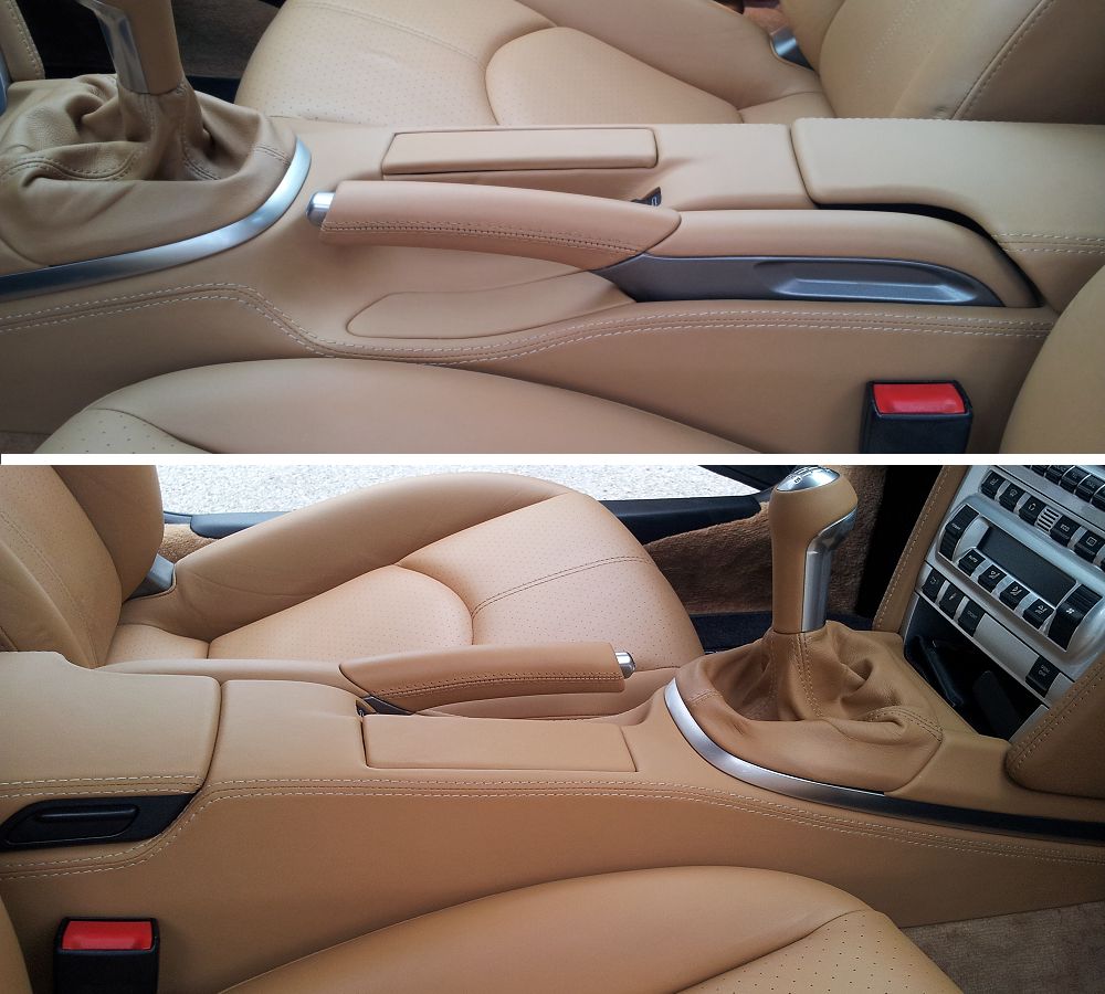 Bei der Mittelkonsole, schwankte ich lange Zeit zwischen Leder und Lackierung in Alu-Optik. Die nun vorgenommene Belederung paßt hervorragend zum bestehenden Stil, insofern die richtige Entscheidung. AIM hat perfekte Arbeit geleistet, die Ziernähte selbstverständlich in der originalen Porsche-Stichweite, den Verlauf habe ich mit AIM abweichend zum Porsche Original festgelegt. Die gleichfalls neue belederte Abdeckung der hinteren Ablage fügt sich gut ein: