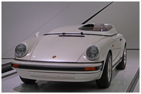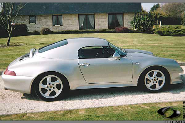 Das Fahrzeug entstand auf einem 1986er G-Modell, hat den turbo-Look, 993-turbo-Felgen und turbo-Sitze (soweit ich es erkennen kann allerdings vom 996). Außerdem ist das Fahrzeug noch nie mit einem Softtop, sondern immer nur mit Hardtop fotografiert worden, insofern gehe ich davon aus, daß er kein Stoffverdeck hat.